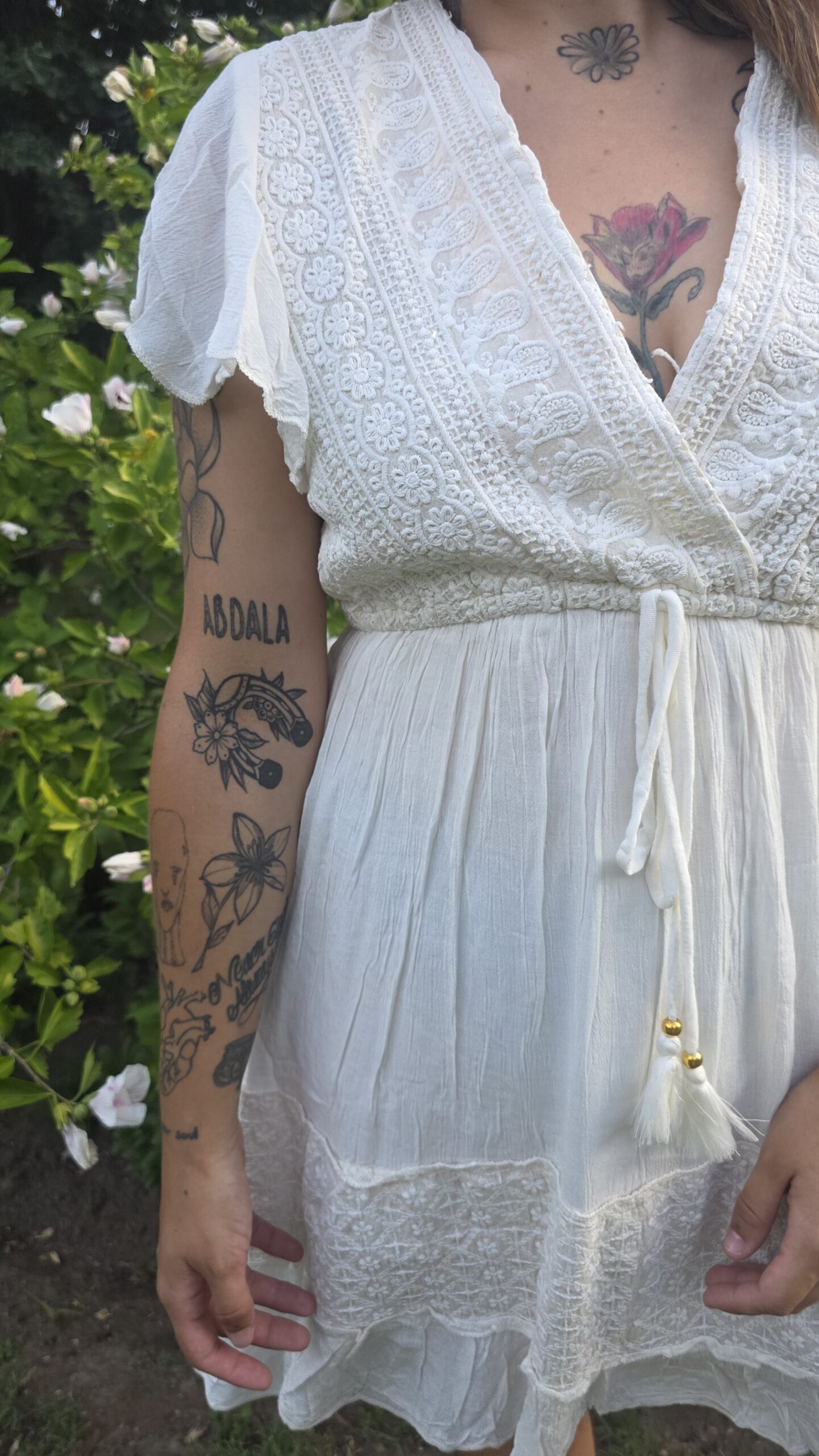 UN CORTE DEBAJO DEL BUSTO ,CON BORDADO EN EL PECHO Y LA ESPALDA.